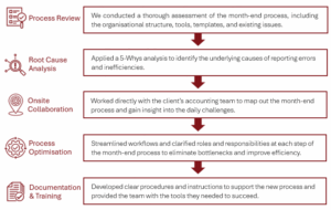 We implemented a structured, targeted approach to transform the client’s month-end reporting. By reviewing existing processes, clarifying roles, and standardising workflows and documentation, we created a more efficient, accurate, and sustainable reporting process that increased confidence in financial outcomes.