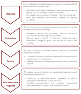 Xenco led a structured, phased transition program designed to mitigate risk, secure critical knowledge, and ensure operational continuity. The approach was governed through four key stages: