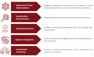 The objective was to align departments and key contractors to a unified approach that enabled effective planning, enhanced transparency of performance, and embedded a culture of continuous improvement across all levels of the operation.