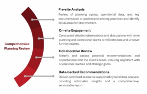 To tackle operational inefficiencies and uncover optimisation opportunities, Xenco implemented a systematic, data-driven approach. Over a 5-day site visit, our team conducted pit observations and engaged with key personnel across planning and operational teams to gather insights and validate findings. The process included: